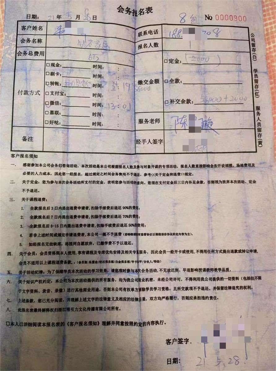 楊濤鳴的另一個弟子富麗有類似經(jīng)歷。2020年,繳納14萬元后意識到“可能陷入騙局”,她找到吸引公司要求退款,拖延至今。