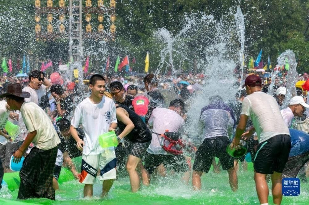 云南省德宏傣族景頗族自治州芒市2023年潑水狂歡節(jié)開幕,人們相互潑灑代表幸福、吉祥的清水,表達著相互間的無限祝福。