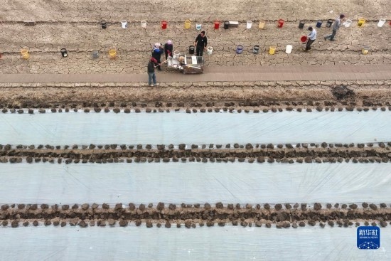 4月18日,唐山市豐南區(qū)西葛鎮(zhèn)的農(nóng)民在田間使用機械設(shè)備育秧(無人機照片)。
