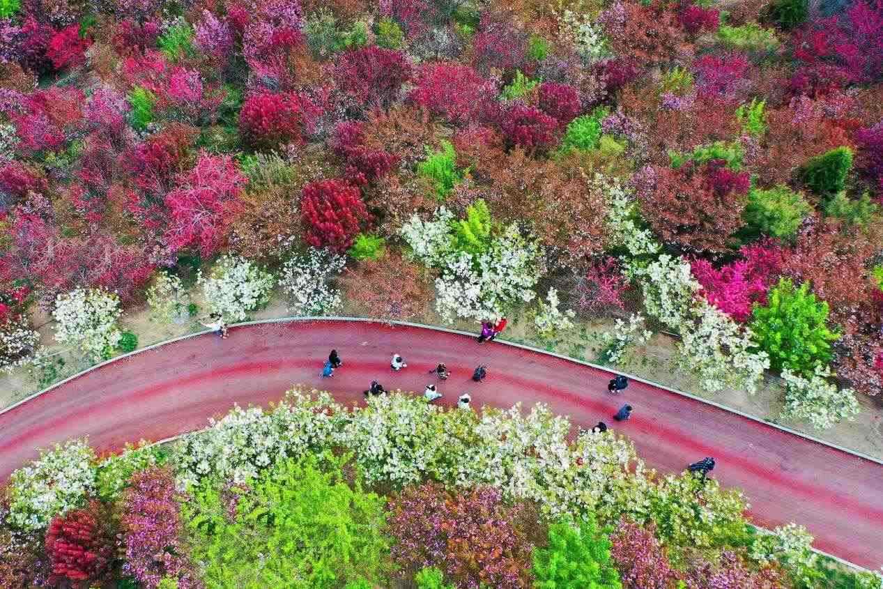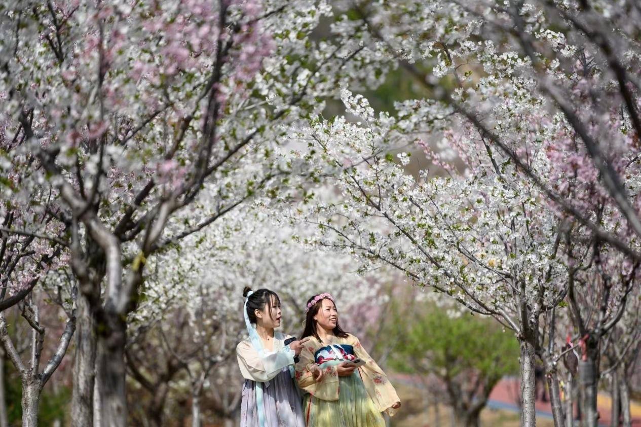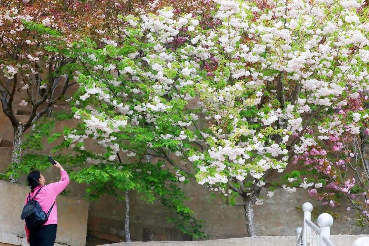 櫻花園里,各類(lèi)櫻花搖曳生姿,爭(zhēng)相怒放,景色宜人,構(gòu)成一幅幅明麗的春日畫(huà)圖。前來(lái)觀賞的游客紛紛在櫻花樹(shù)下拍照打卡。