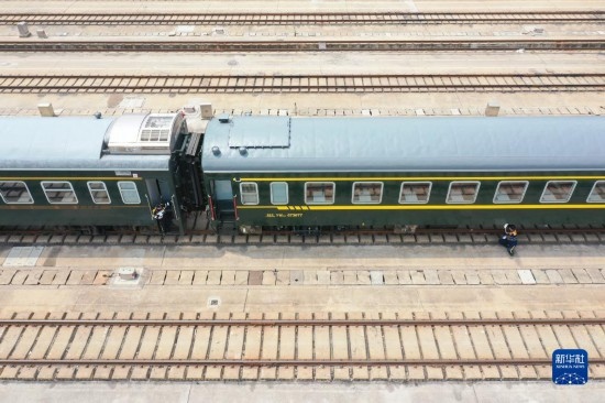 4月28日,中國鐵路上海局集團有限公司徐州站的鐵路連結員在對臨時旅客列車進行拉風作業(yè)(無人機照片)。