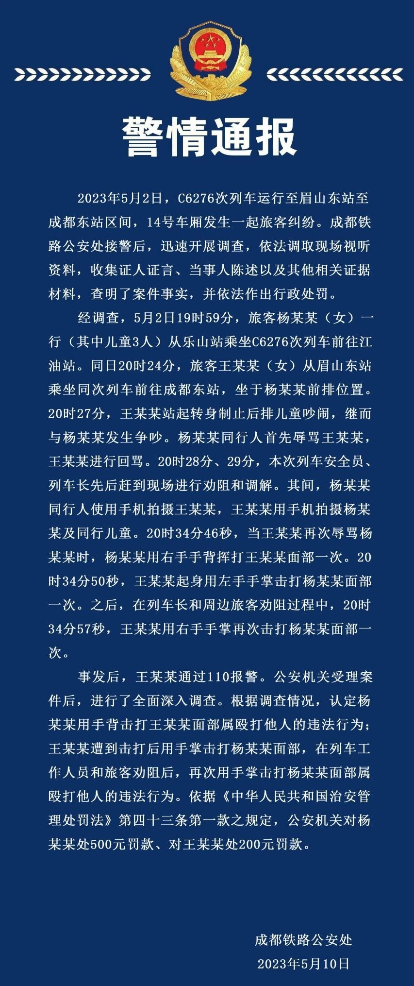 ·成都鐵路公安處通報高鐵掌摑事件:王某某遭擊打后兩次擊打楊某某面部,雙方均違法。