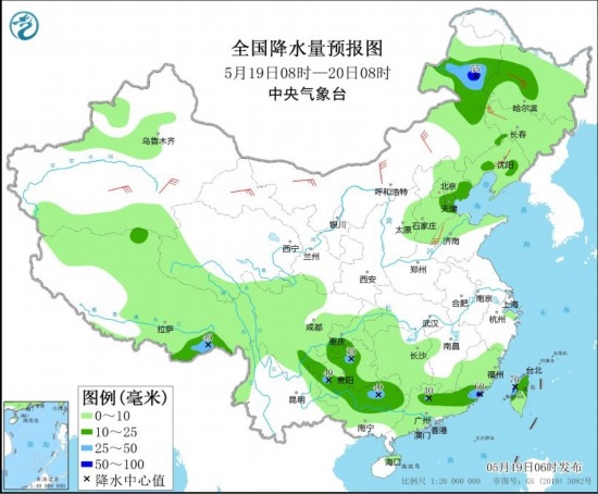 5月19日08時至20日08時,內(nèi)蒙古東部、東北地區(qū)、華北中東部、新疆北部、西藏、西南地區(qū)東部和北部、江南西部和南部、華南大部等地部分地區(qū)有小到中雨,局地有大雨或暴雨(50~70毫米),上述部分地區(qū)伴有短時強降水,局地有雷暴大風或冰雹等強對流天氣。內(nèi)蒙古、東北地區(qū)、西北地區(qū)東部等地部分地區(qū)有4~6級風。