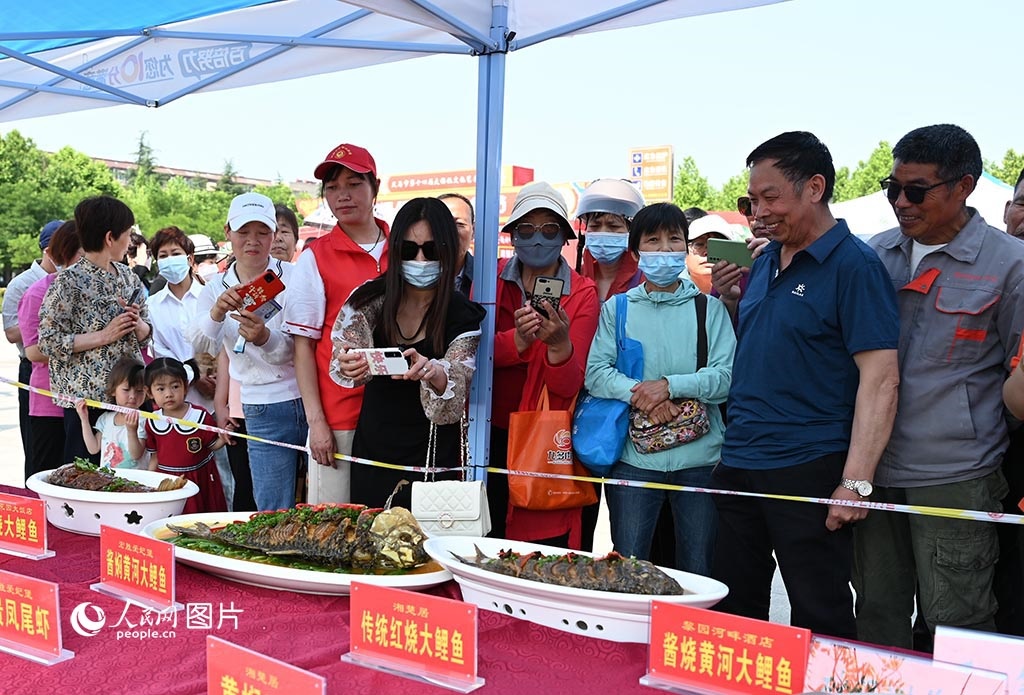 5月17日,“中國旅游日”主題周活動期間,河南省義馬市舉辦“櫻紅五月”美食節(jié),集中展示當?shù)氐奶厣朗?、名?yōu)特產(chǎn),為了讓游客有更好的體驗,當?shù)?2家飯店還進行了精彩紛呈的廚藝大比拼?;顒蝇F(xiàn)場,游客在圍觀經(jīng)典豫菜“紅燒黃河大鯉魚”。人民網(wǎng)記者 王玉興攝