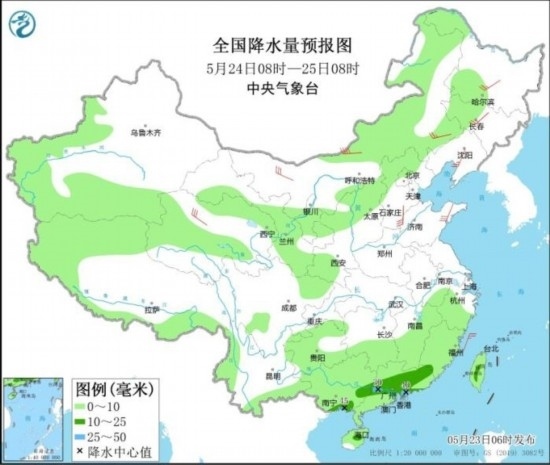 5月23日08時至24日08時,華南南部、臺灣島等地部分地區(qū)有中到大雨,其中,廣西東南部沿海、廣東西南部沿海等地局地有暴雨(50~90毫米)。新疆、內(nèi)蒙古中西部和東北部等地部分地區(qū)有4~6級風。