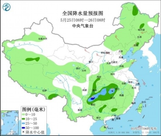 5月25日08時至26日08時,內(nèi)蒙古東北部、黑龍江南部、遼寧中北部、江漢、江南北部、西南地區(qū)東部、廣西東北部等地部分地區(qū)有中到大雨,其中,貴州北部等地部分地區(qū)有暴雨(50~60毫米)。內(nèi)蒙古、東北地區(qū)、山東半島等地的部分地區(qū)有4~6級風。