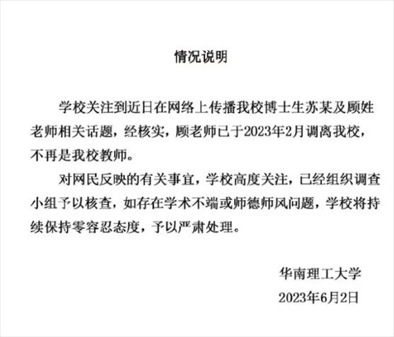 網(wǎng)傳女博士介入導(dǎo)師婚姻,導(dǎo)師帶其發(fā)高水平論文,華南理工大學(xué)、四川大學(xué)啟動調(diào)查工作。