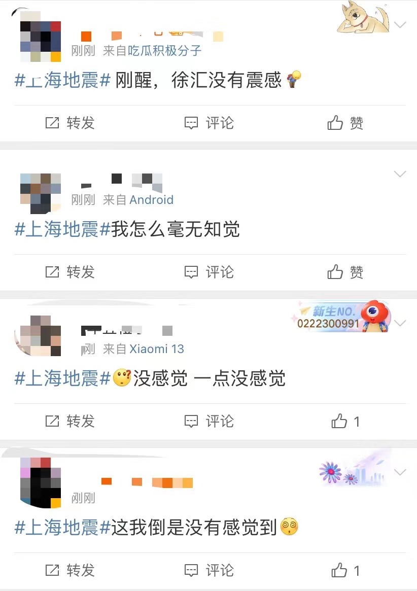 有網友表示,“床明顯在晃動”“持續(xù)了四五秒”“徐匯輕微有震感”,不過也有很多網友表示,“在睡夢中完全沒有感覺到”。