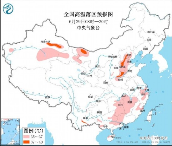 圖3 全國高溫落區(qū)預(yù)報圖(6月29日08時-20時) 圖自中央氣象臺網(wǎng)站