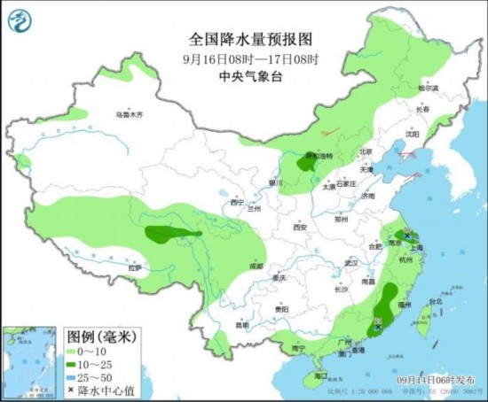 9月16日08時至17日08時,內(nèi)蒙古東部和西部、黑龍江中西部、吉林西部、新疆北疆北部、西藏大部、西北地區(qū)中部、陜西北部、華北北部、江淮東部、江南中東部和南部、西南地區(qū)北部、四川盆地西北部、華南大部、臺灣島等地部分地區(qū)有小到中雨,其中,江蘇中南部、廣東東南部等地部分地區(qū)有大雨(25~40毫米)。內(nèi)蒙古中部、遼東半島、山東半島等地部分地區(qū)有4~5級風。