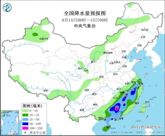 9月14日08時至15日08時,江南中東部和南部、華南中北部和南部等地部分地區(qū)有中到大雨,其中,湖南南部、江西中南部、浙江中部、廣西東北部、廣東中部和西北部等地部分地區(qū)有暴雨或大暴雨(100~150毫米)。內(nèi)蒙古東北部、新疆南疆盆地、河北北部、山東半島、江蘇南部等地部分地區(qū)有4~5級風。