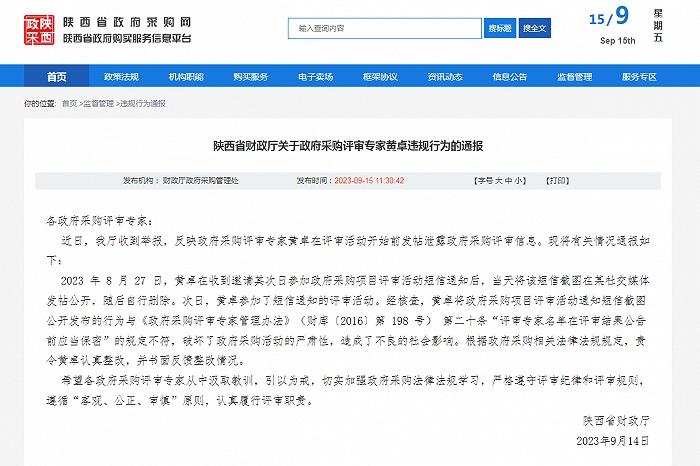 ·一名政府采購評審專家被舉報泄露評審信息,陜西省財政廳通報。