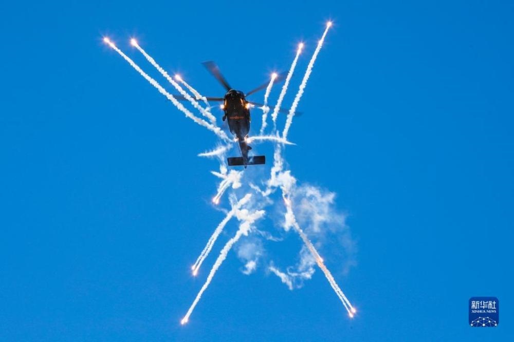 在第六屆中國天津國際直升機博覽會開幕式上,陸軍“風(fēng)雷”飛行表演隊直-20戰(zhàn)術(shù)通用直升機發(fā)射干擾彈。?