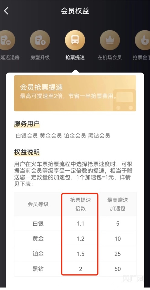 記者發(fā)現(xiàn),在另一個(gè)第三方購(gòu)票平臺(tái),會(huì)員分為普通、白銀、黃金、鉑金、黑鉆等不同等級(jí),不同等級(jí)享受不同權(quán)益。從搶票提速這一權(quán)益來(lái)看,普通會(huì)員并未享受搶票提速這一權(quán)益,而白銀到黑鉆會(huì)員的搶票速度則依次提高1.1倍、1.2倍、1.5倍、2倍。