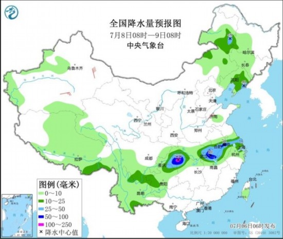 全國降水量預(yù)報圖(7月8日08時-9日08時)。圖片來源:中央氣象臺網(wǎng)站