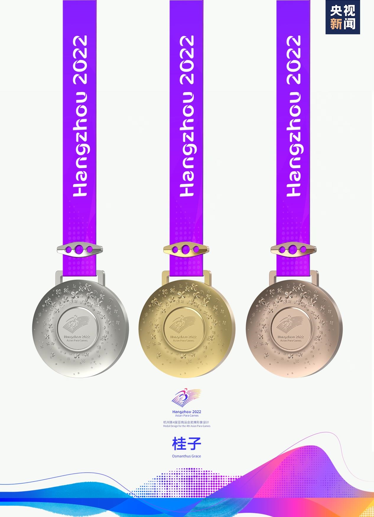 獎(jiǎng)牌將良渚玉璧和杭州市花——桂花融為一體,以蒼璧禮天,傳遞亞洲價(jià)值文化的多元和融合,以桂花的濃郁氣質(zhì),表達(dá)辦賽城市的熱烈期盼,以“桂子”寓意運(yùn)動(dòng)員向往美好、積極進(jìn)取的精神追求。