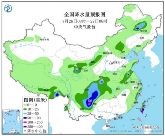 圖3 全國降水量預(yù)報圖(7月25日08時-26日08時)