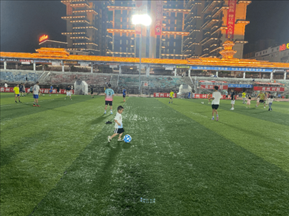 在比賽間隙和結(jié)束后,觀眾席上的孩子們會(huì)沖進(jìn)球場(chǎng),玩起傳球、盤帶和射門;工作日的晚上,“村超”體育場(chǎng)上,有很多踢球的身影,有中學(xué)足球隊(duì)的隊(duì)員,有八九歲的小學(xué)生,還有剛剛學(xué)會(huì)走路的小朋友。