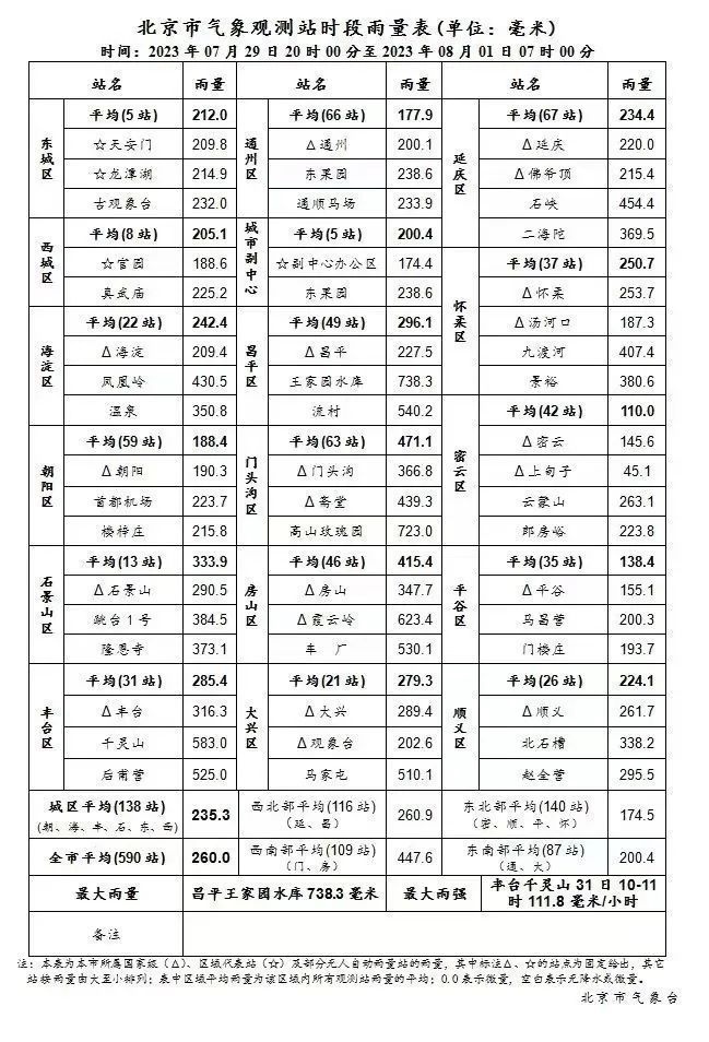 目前,北京有2站累計(jì)雨量超700毫米,分別為昌平王家園水庫738.3毫米,門頭溝高山玫瑰園723.0毫米。8月1日6-7時(shí)最大降雨出現(xiàn)在平谷掛甲峪31.1毫米。