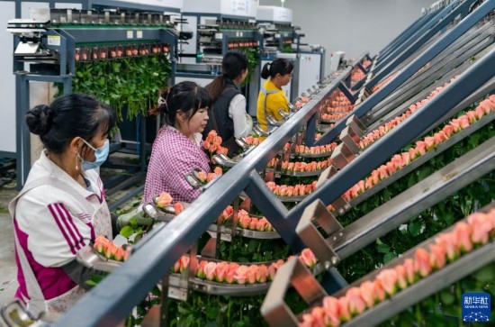 這是云天化晉寧花卉產(chǎn)業(yè)現(xiàn)代化示范園內(nèi)的鮮花包裝流水線(7月12日攝)。新華社記者 陳欣波 攝
