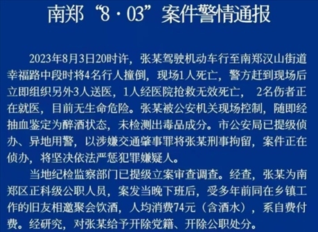 ·陜西漢中市一正科級公職人員張某,醉酒開車撞倒4人,致2死2傷。張某被開除黨籍、公職。