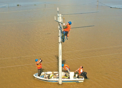 8月9日,國網(wǎng)長(zhǎng)春供電公司搶修人員在吉林省榆樹市懷家12組進(jìn)行作業(yè),為受災(zāi)群眾恢復(fù)生活用電。孟海鷹 張 鵬攝影報(bào)道