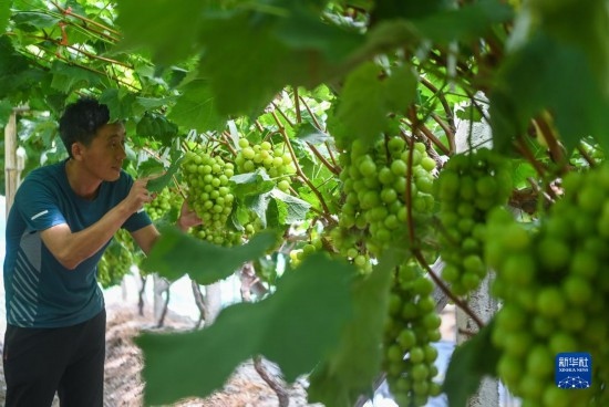 8月20日,在諸暨市姚江鎮(zhèn)紫草塢村阿群家庭農場的葡萄大棚內,種植戶壽怒濤查看葡萄的成熟度。壽怒濤通過農技培訓學習葡萄種植新技術,提高葡萄的口感和產量。