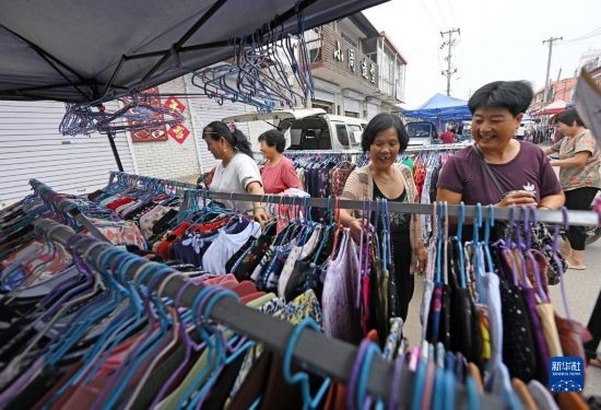 8月25日,前來趕集的村民在大集上挑選衣服。