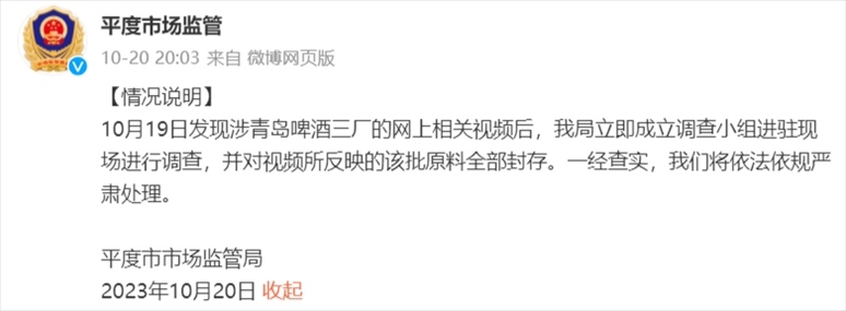青島啤酒方面在10月20日晚間發(fā)布的回應(yīng)稱,針對10月19日網(wǎng)上出現(xiàn)的青島啤酒三廠的相關(guān)視頻,公司高度重視,第一時間向公安機關(guān)報警,公安機關(guān)已介入調(diào)查。目前,該批麥芽已經(jīng)全部封存。公司繼續(xù)加大管理力度,確保產(chǎn)品質(zhì)量,歡迎廣大消費者監(jiān)督。