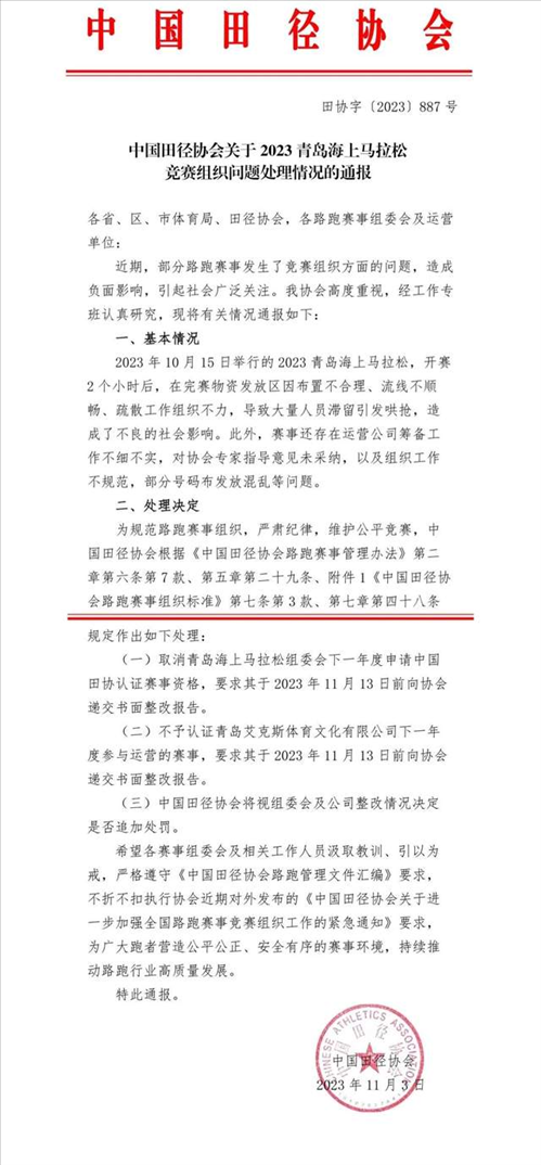 ·中國田協(xié)通報大連馬拉松和青島海上馬拉松問題處理情況。