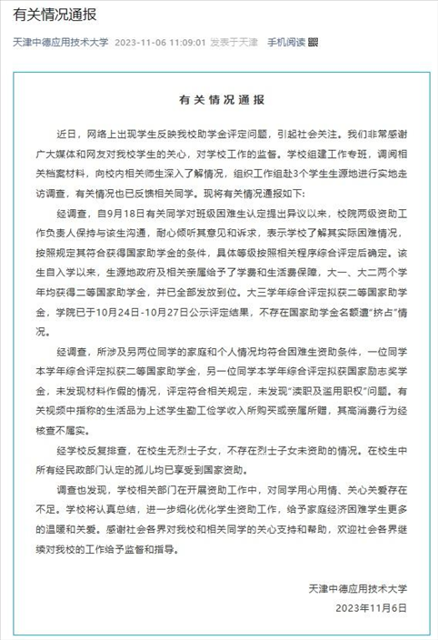 ·天津中德應(yīng)用技術(shù)大學通報助學金事件調(diào)查結(jié)果:不存在國家助學金名額遭“擠占”情況。