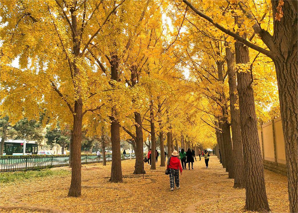 北京釣魚臺銀杏大道一片金黃,進入最佳觀賞期,吸引市民前來打卡游玩拍照。