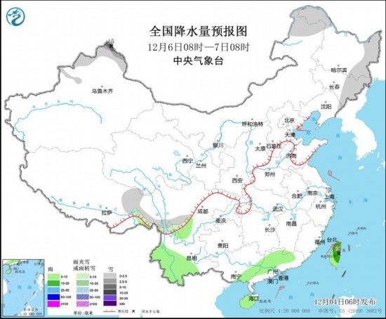 12月6日08時至7日08時,新疆北疆北部、內(nèi)蒙古東北部、黑龍江西北部和東部、吉林東部、西藏東部等地部分地區(qū)有小雪或雨夾雪,其中,新疆阿勒泰山區(qū)等地部分地區(qū)有中雪到大雪,局地暴雪(10~15毫米)。云南中西部、廣西東部、廣東北部、海南島、臺灣島等地部分地區(qū)有小雨,其中,臺灣島的部分地區(qū)有中雨(10~20毫米)。