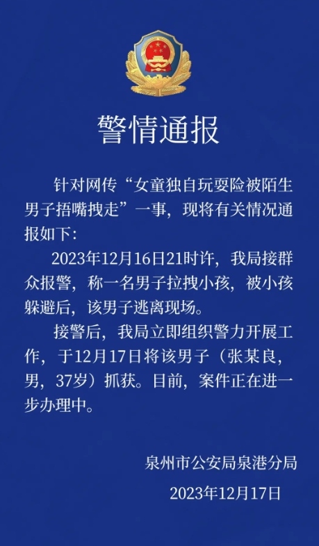 ·警方通報(bào)福建泉州一女童險(xiǎn)被陌生男子捂嘴拽走:已將該男子抓獲。