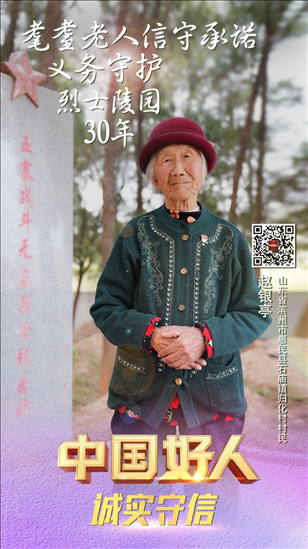 趙銀亭,女,1929年10月生,中共黨員,山東省濱州市惠民縣石廟鎮(zhèn)歸化村村民。趙銀亭是一位有75年黨齡的老黨員。1992年,當(dāng)?shù)亟⒘沂苛陥@,需要一位守陵人,63歲的趙銀亭主動報了名。自此,她與丈夫搬到了距烈士陵園不過15米的舊屋居住。30多年來,她堅(jiān)守信仰,守護(hù)烈士陵園,為前來參觀的人員講述英烈故事。