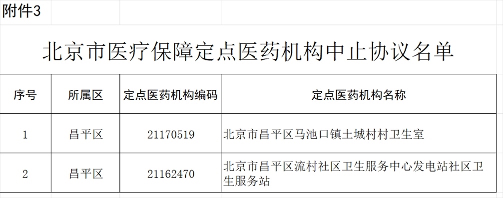 北京市昌平區(qū)馬池口鎮(zhèn)土城村村衛(wèi)生室等2家定點醫(yī)藥機構因不能繼續(xù)為參保人員提供服務,申請中止協(xié)議,經(jīng)市、區(qū)醫(yī)保經(jīng)辦機構審核,現(xiàn)決定對上述2家定點醫(yī)藥機構中止協(xié)議(見附件3)。