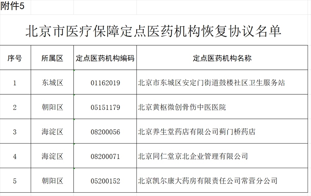 北京市東城區(qū)安定門街道鼓樓社區(qū)衛(wèi)生服務站等5家醫(yī)藥機構申請恢復協(xié)議,經(jīng)市、區(qū)醫(yī)保經(jīng)辦機構審核,上述5家醫(yī)藥機構已經(jīng)具備承擔醫(yī)療保障任務的條件,現(xiàn)決定對上述5家醫(yī)藥機構恢復協(xié)議(見附件5)。