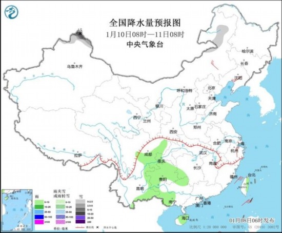 全國降水量預(yù)報(bào)圖(1月9日08時(shí)-10日08時(shí)) 來源:中央氣象臺(tái)網(wǎng)站