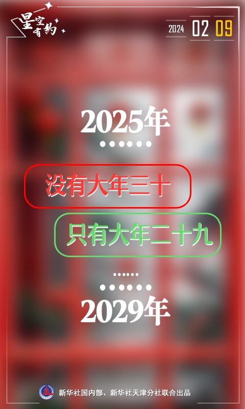 新華社天津1月13日電(記者周潤?。┙找粍t“未來5年都沒有大年三十”的消息引發(fā)公眾關(guān)注。消息稱,2024年2月9日是近年來最后一個(gè)大年三十,因?yàn)閺?025年起至2029年都沒有大年三十,只有大年二十九。天文科普專家表示,大年三十時(shí)有時(shí)無是正常歷法現(xiàn)象,系農(nóng)歷大小月所致。