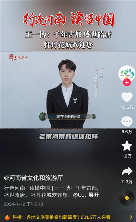 有人統(tǒng)計(jì),自1月9日起,河南文旅官方賬號(hào)“河南省文化和旅游廳”每天發(fā)布二三十條視頻,連續(xù)四天發(fā)布了112條視頻,持續(xù)展示本地文旅資源,吸引了近百萬新粉絲,主打一個(gè)“量變總會(huì)引起質(zhì)變”,以至于“河南文旅到底發(fā)了多少抖音”相關(guān)話題成為熱門搜索。