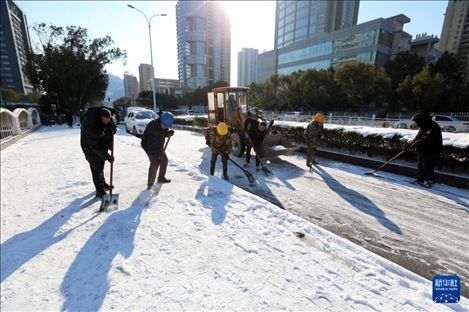 1月23日,在浙江省溫嶺市,人們?cè)谇宄访姹?。近日,受寒潮天氣影響,我?guó)多地迎來(lái)降溫降雪天氣,各地積極組織相關(guān)部門(mén)開(kāi)展抗凝除雪工作,保安全保暢通。新華社發(fā)(周學(xué)軍攝)