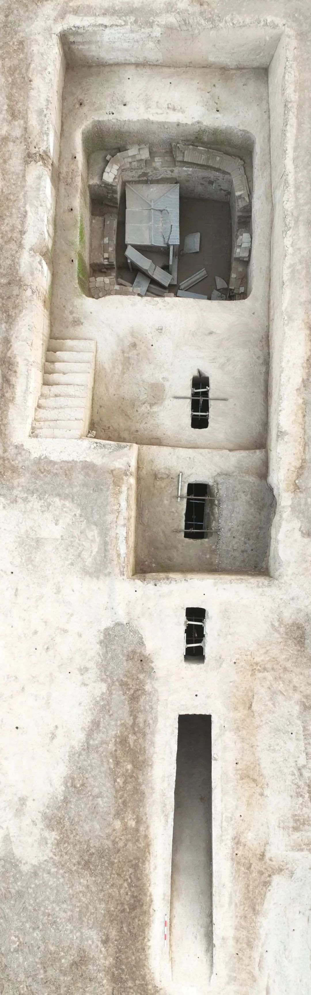 該墓為斜坡墓道三天井單室磚室墓,遭嚴重盜擾,石門,墓室頂部等均被破壞,墓室內(nèi)各類器物已被盜掘一空,僅發(fā)現(xiàn)有少量陶器殘片。墓道兩側(cè)各分布有兩個壁龕,壁龕內(nèi)殘存陶雞、陶狗、陶駱駝等動物俑七十余件。