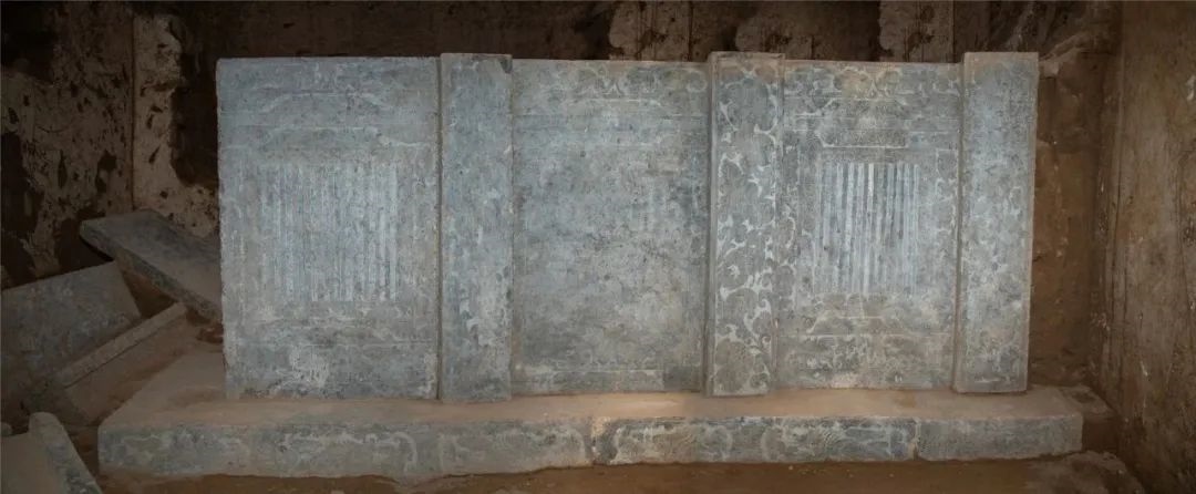 墓室西側(cè)發(fā)現(xiàn)石槨一具,保存較好。石槨面闊三間,進深兩間,頂部為廡殿式,僅一側(cè)雕刻有瓦棱;槨身由壁板和倚柱卯和而成,板壁外側(cè)雕刻門窗、卷云及神獸,內(nèi)側(cè)主體為侍女,周邊飾有花草等內(nèi)容;倚柱內(nèi)外均刻纏枝卷草花朵,部分穿插飛禽走獸;基座以七塊石板鋪成,立面間隔刻有壸門圖案,內(nèi)填奔獸圖樣。石槨線刻精細,畫面華麗而不繁縟,人物體態(tài)豐腴而不臃腫,充分體現(xiàn)出盛唐開元時期圖案靈動、富于想象的特征。