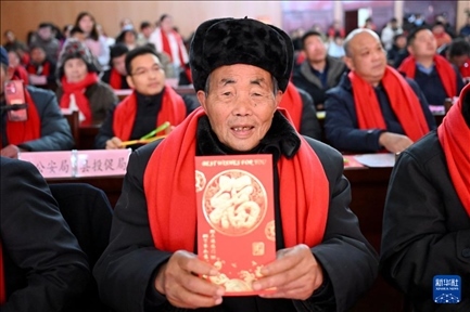 2月1日,在鳳陽(yáng)縣小崗村,“大包干”帶頭人嚴(yán)金昌展示自家領(lǐng)取的分紅紅包。新華社記者 黃博涵 攝