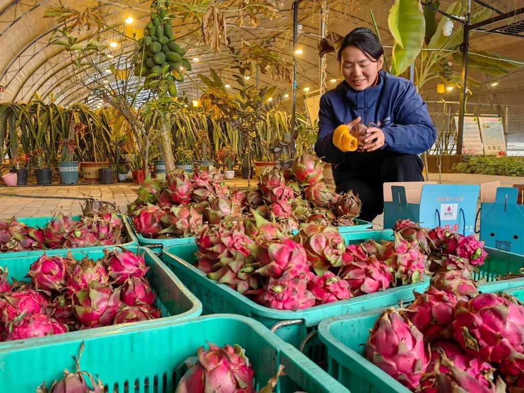 郭娟茹正在查看即將打包、裝箱、發(fā)運(yùn)的新鮮火龍果。 新華社記者孫正好 攝