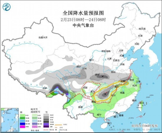 2月23日8時至24日8時,甘肅南部、陜西東南部、黃淮西部、江淮、江漢、江南北部、青海東南部、西藏東部和南部等地部分地區(qū)有小到中雪或雨夾雪,其中,西藏東南部等地局地有大到暴雪。西藏東南部、云南西北部等地部分地區(qū)有中到大雨。東海、南海、臺灣海峽有7~8級,陣風9~10級的大風。