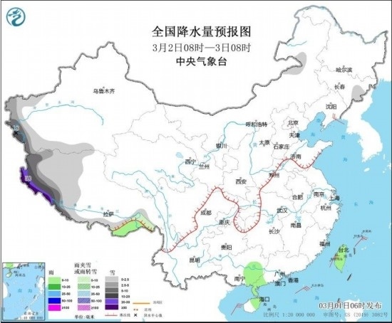 全國降水量預報圖(3月2日08時-3日08時)