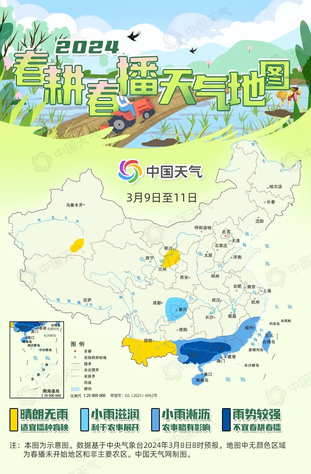 中國天氣網(wǎng)氣象分析師李靚介紹,3月9日至11日,廣西西部、廣東東部和北部、福建大部、海南島等地小雨淅瀝,對(duì)田間作業(yè)略有影響。廣西東部、廣東西部和中部有2至3天中雨,部分地區(qū)甚至將有大雨或暴雨,對(duì)春耕春播作業(yè)影響較為明顯。