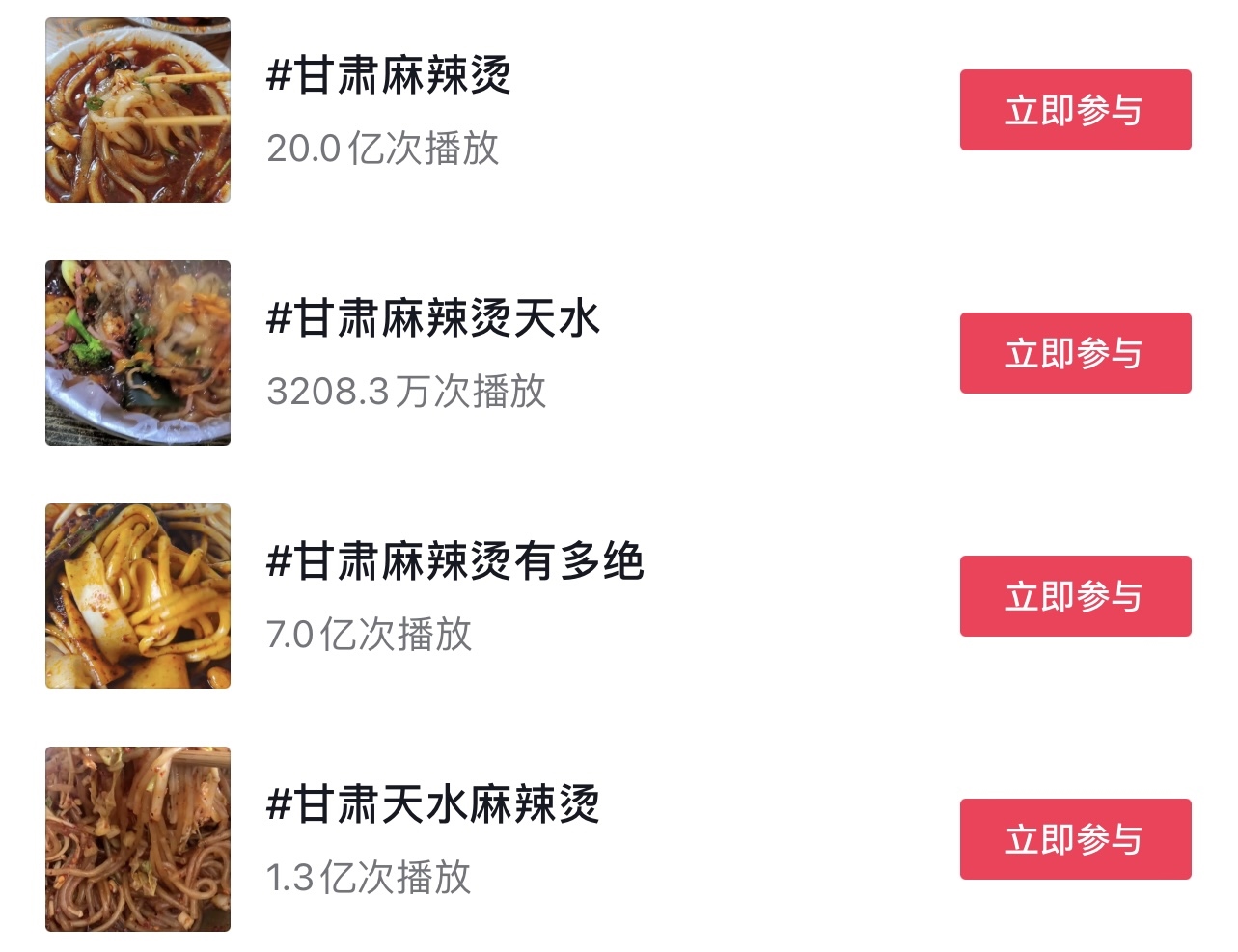 “這兩條視頻吸引了大量網(wǎng)民觀看、點(diǎn)贊、轉(zhuǎn)發(fā),之后陸續(xù)有網(wǎng)民發(fā)布相關(guān)視頻?!?月18日,甘肅省文化和旅游廳在回復(fù)網(wǎng)友建議中提到,3月份以來,“甘肅麻辣燙”話題迅速發(fā)酵,視頻內(nèi)容迅速增加,多次登上抖音、快手等短視頻平臺(tái)熱榜。截至3月16日18:00,各大短視頻平臺(tái)上“甘肅麻辣燙”相關(guān)話題累計(jì)播放量已超過32.6億次。
