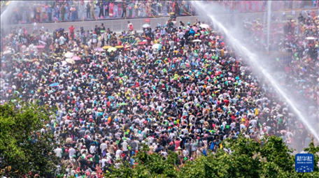 4月12日,云南省德宏傣族景頗族自治州2024年潑水狂歡節(jié)在芒市開幕,上萬名當(dāng)?shù)馗髯迦罕娕c遠(yuǎn)道而來的游客歡聚芒市廣場,互相潑水祝福。